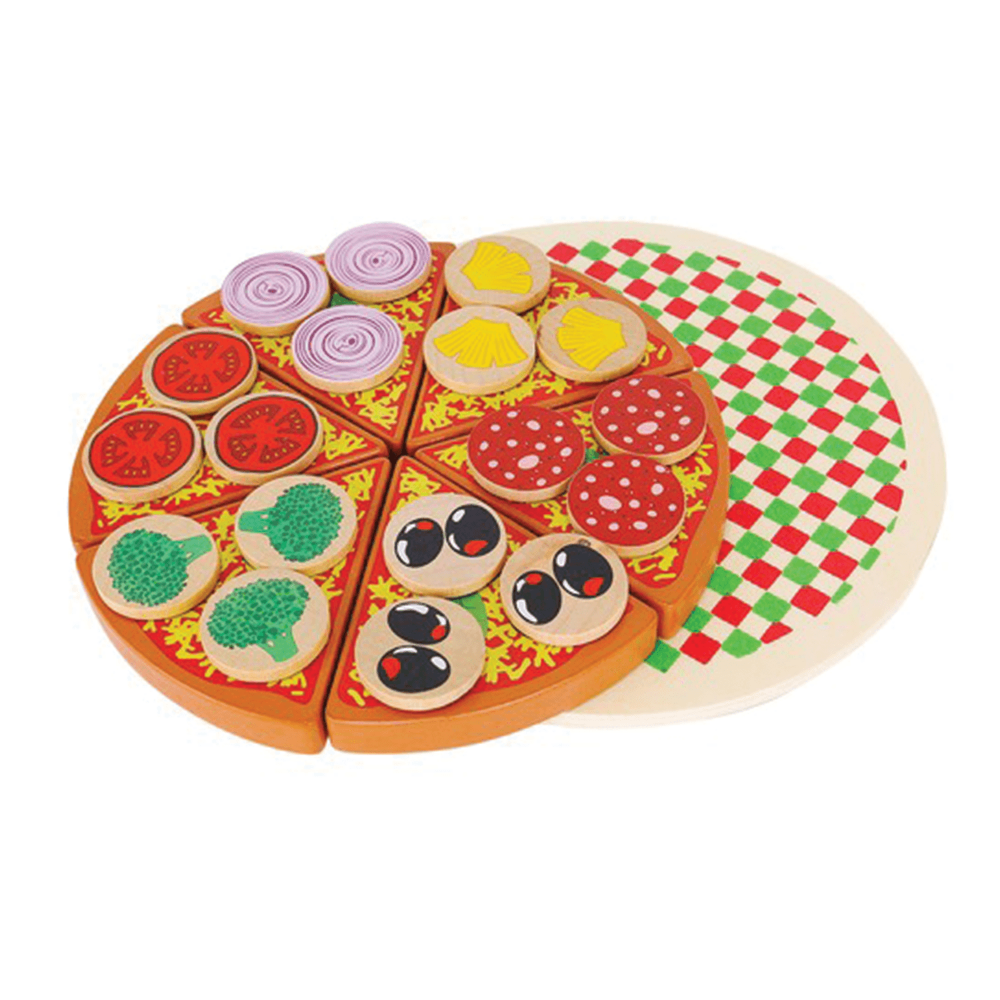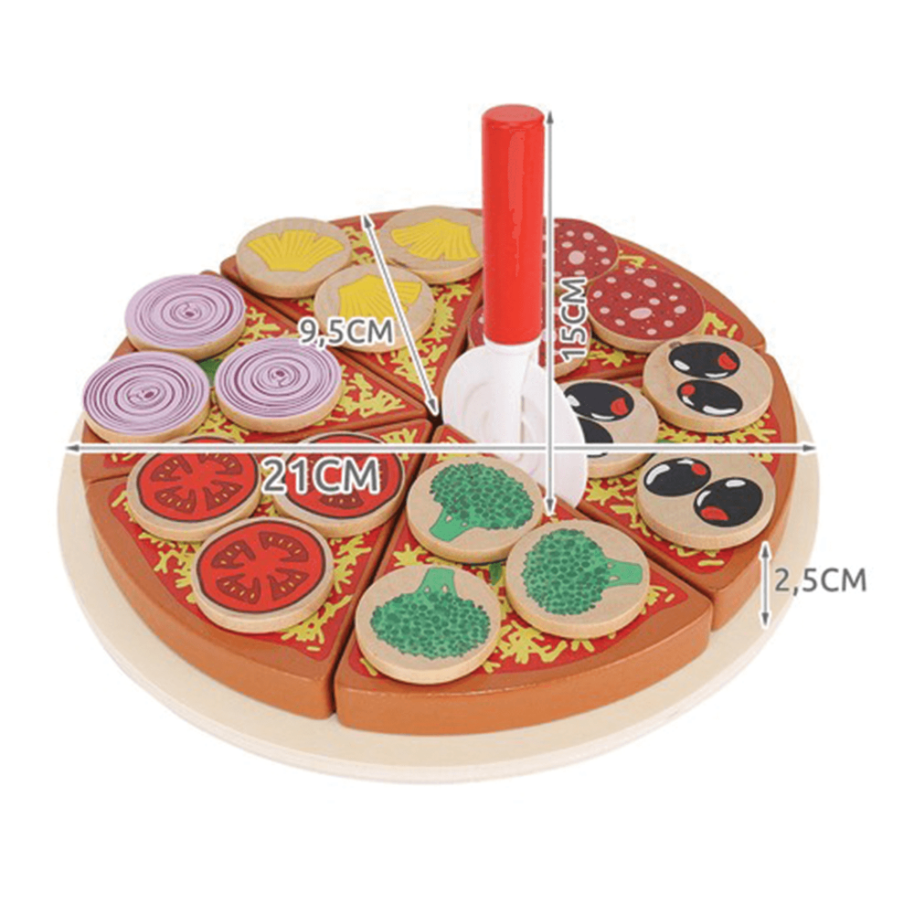 Dřevěná pizza na krájení je ideální hračka pro malé kuchaře, kteří si rádi hrají na vaření, restauraci nebo oslavy. Jednotlivé dílky pizzy i barevné ingredience jsou spojeny suchým zipem, díky kterému je lze snadno „krájet“ a znovu skládat dohromady bez rozsypání polevy. Sada obsahuje bohaté příslušenství včetně stojánku, dětského nože, řezačky a různých druhů zeleniny i salámu. Vše je vyrobeno z kvalitního dřeva natřeného zdravotně nezávadnými barvami, bez ostrých hran. Hra rozvíjí jemnou motoriku, koordinaci pohybů, kreativitu i logické myšlení a je vhodná pro holky i kluky.