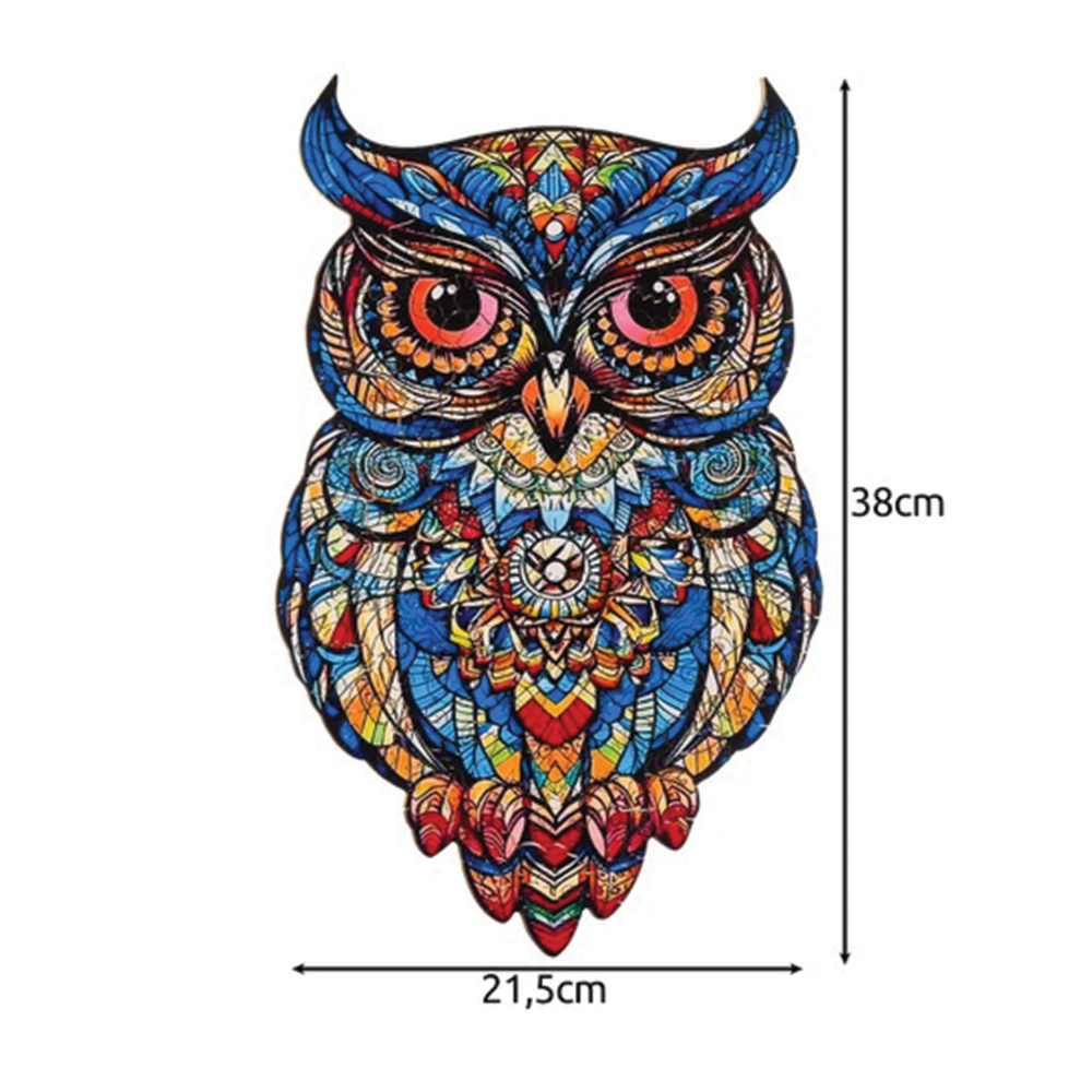 Dřevěné puzzle sova, 177 dílů, 38 × 21,5 cm představují originální, ekologickou a kreativní zábavu pro děti i dospělé. Každý dílek je laserově přesně vyřezaný z kvalitní dřevěné překližky, což zaručuje precizní spojení a dlouhou životnost celé sady. Puzzle mají hladké hrany, jsou bezpečné na dotek a díky barevnému zpracování vypadají po složení jako skutečné umělecké dílo. Po dokončení skládačky vznikne barevná sova s nepravidelným tvarem, který připomíná siluetu ptáka. Výsledný obraz působí elegantně a může sloužit také jako dekorace interiéru. Díky svým rozměrům se hodí k vystavení například do dětského pokoje, pracovny či obýváku. Puzzle trénují logické myšlení, paměť, koncentraci a jemnou motoriku. Zároveň poskytují prostor pro relaxaci a zklidnění mysli, takže jsou ideální jako volnočasová aktivita pro celou rodinu. Díky atraktivnímu balení jsou i skvělým dárkem pro děti i dospělé.
