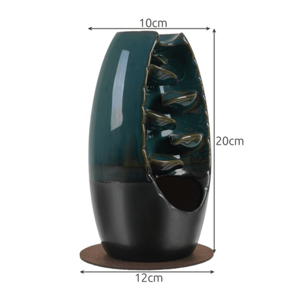 Designový keramický vonný krb se zpětným prouděním vytváří jedinečný vizuální efekt kouřového vodopádu, který působí uklidňujícím a harmonickým dojmem. Speciální vonné tyčinky produkují hustší kouř, jenž pomalu stéká po drážkách krbu jako jemná mlha. Kvalitní keramické provedení je doplněno elegantní dubovou podložkou s plstěnou spodní vrstvou pro ochranu nábytku.