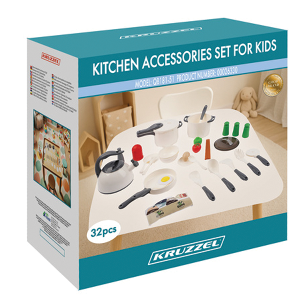 Kuchyňské doplňky pro děti - 32dílná sada nádobí je ideální hračkou pro malé kuchaře a kuchařky. Díky této bohaté sadě si děti mohou vyzkoušet vaření, servírování i stolování. Hra podporuje rozvoj kreativity, fantazie, manuálních dovedností i sociálních interakcí při hře ve skupině. Barevné provedení a realistické detaily dělají z této sady oblíbený doplněk pro každodenní hraní.
