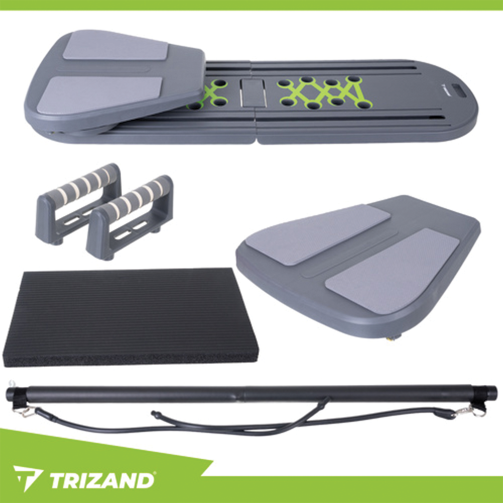 Multifunkční pilatesová cvičící deska je kompletní tréninkové vybavení určené pro domácí cvičení, posilovnu i venkovní použití. Kombinuje funkce pilates reformeru, balanční desky, planku, posilovacího kolečka na břišní svaly, klikových madel a odporových gum, což umožňuje širokou škálu cviků bez nutnosti dalšího příslušenství.