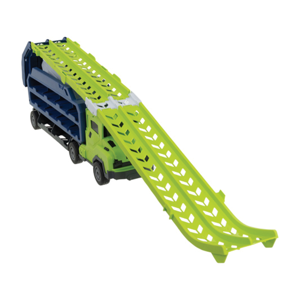 Nákladní vůz s garáží, skluzavkou a sadou 6 kovových autíček je variabilní herní set, který v sobě kombinuje funkci transportéru, parkovacího domu a rychlé závodní dráhy. Hlavní kamion zaujme na první pohled svou robustní konstrukcí a dynamickým zeleno-šedým designem. Díky vestavěnému třecímu pohonu se po zatlačení sám rozjede, zatímco speciální gumová kola zajišťují tichý chod a výbornou stabilitu i na hladkých typech podlah.