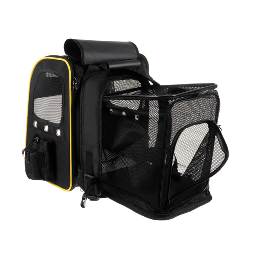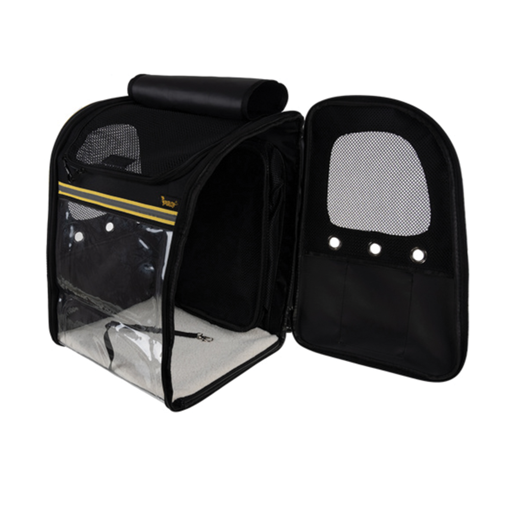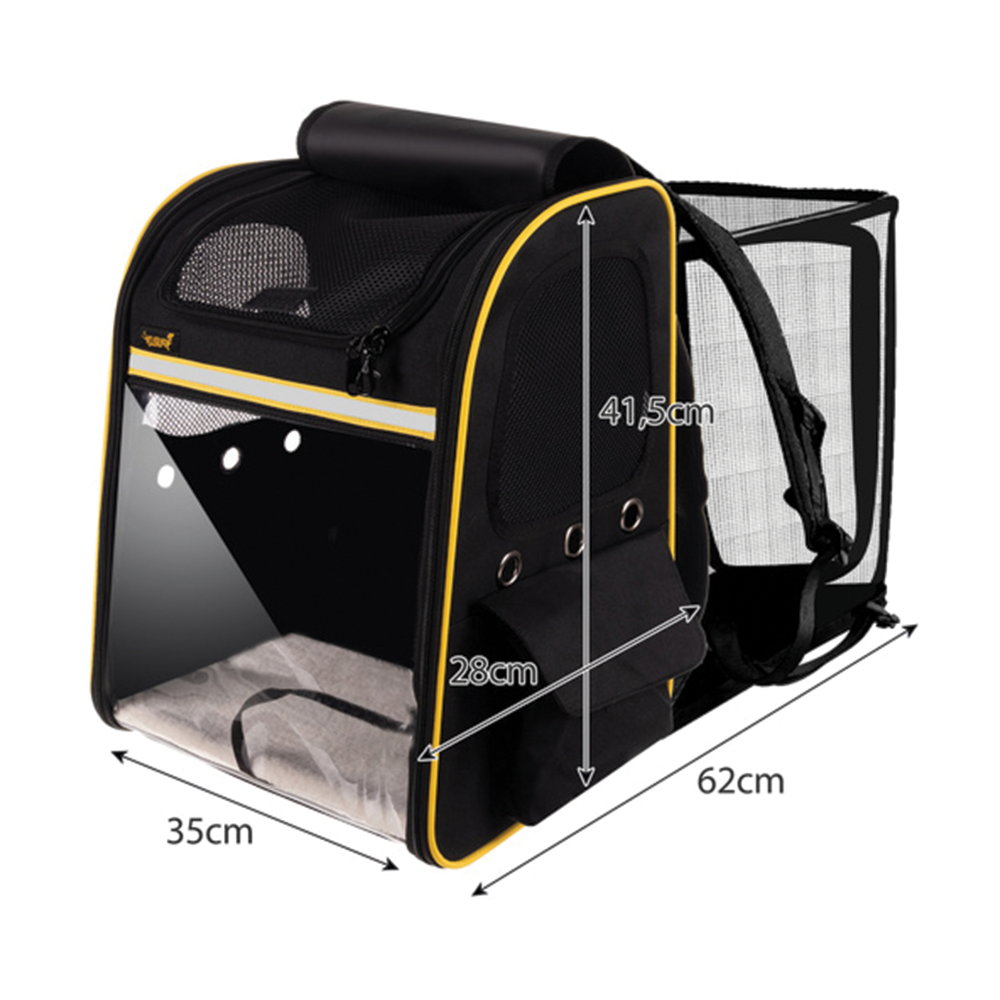 Přepravní batoh s průhlednou přední částí a rozkládací terasou poskytuje vašemu mazlíčkovi bezpečné, pohodlné a dobře větrané místo během cestování i procházek. Díky pevné konstrukci, měkkému polstrování a praktickým kapsám je ideální pro výlety, dovolené i každodenní přesuny se psem nebo kočkou. Po stranách batohu se nachází praktické kapsy na vodu, pamlsky, vodítko nebo další doplňky.