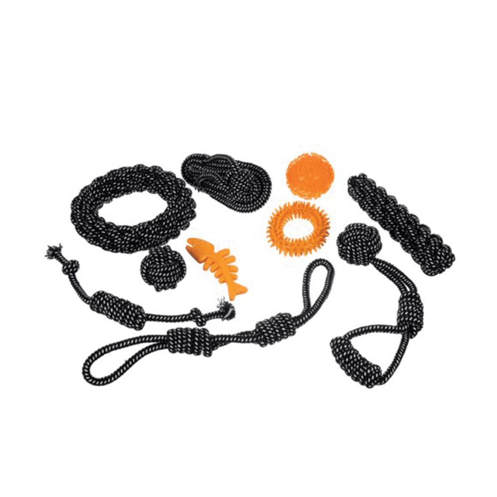 Velká sada hraček pro psy nabízí bohatou kombinaci zábavy, pohybu i mentální stimulace pro psy všech velikostí. Obsahuje lanové tahací hračky, pletená kousátka i interaktivní gumové prvky, které podporují přirozené instinkty ke kousání, tahání a objevování. Odolná lana pomáhají při hře čistit zuby a přispívají ke zdraví dásní.